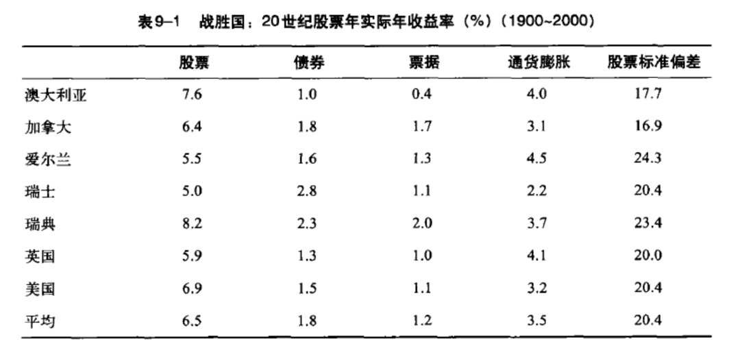 表9-1显示出,20世纪里股票实际年收益率,对那些稳定的战胜国而言是6.5%。